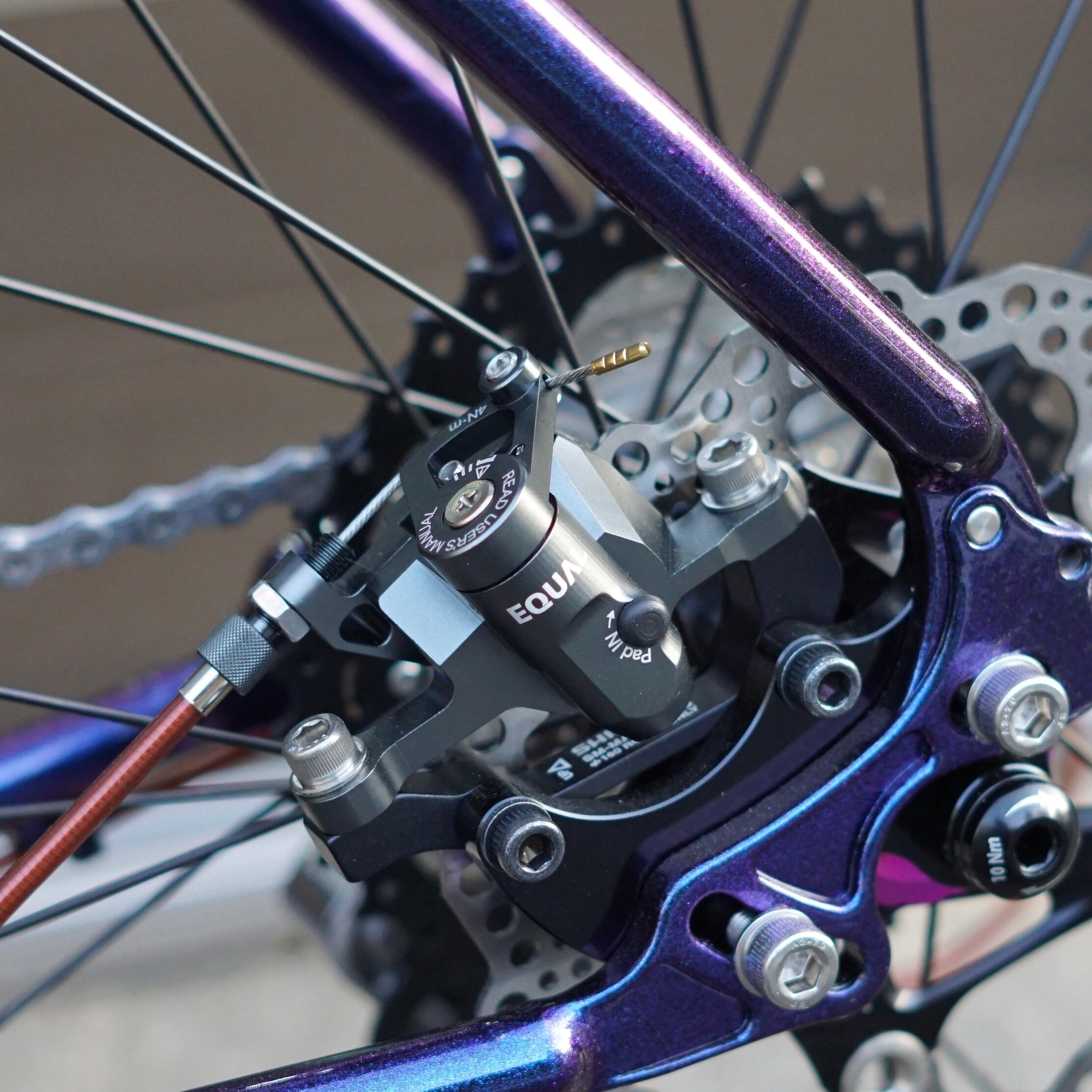 従来のディスクブレーキキャリパーの機構と違い独自に開発されたこのディスクキャリパーは、「制動力」「軽さ」が世界最高クラス。