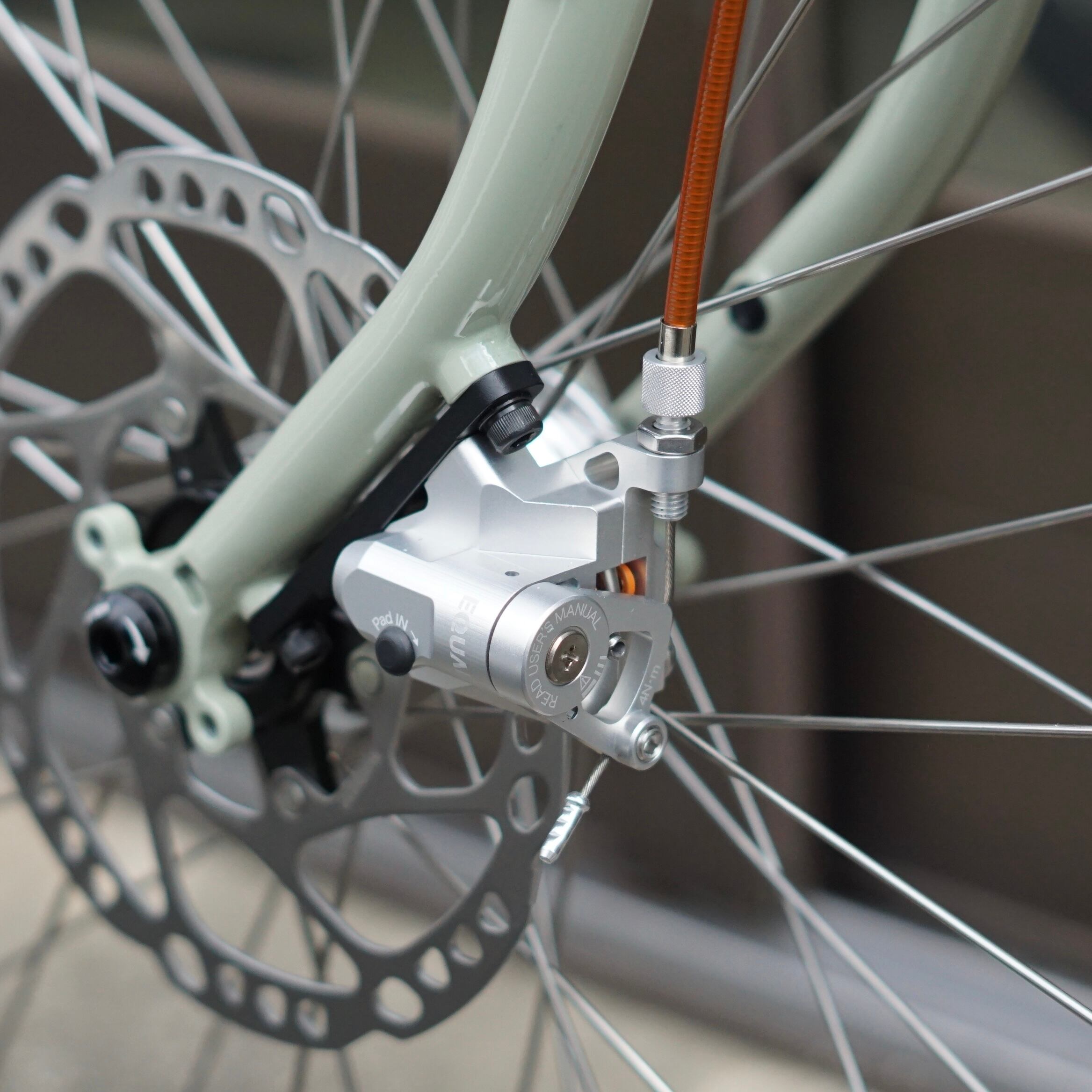 従来のディスクブレーキキャリパーの機構と違い独自に開発されたこのディスクキャリパーは、「制動力」「軽さ」が世界最高クラス。